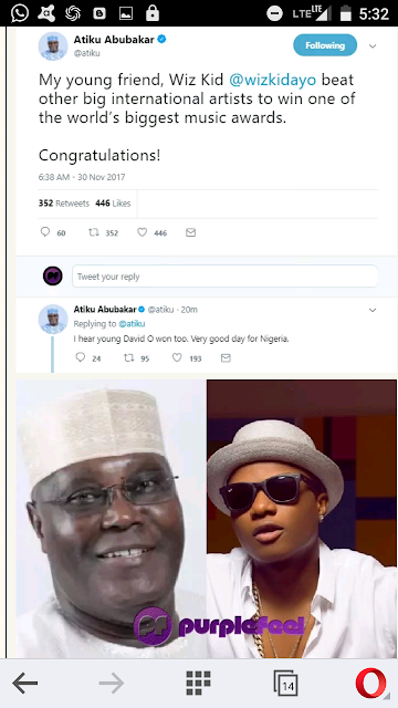 Former Vice President of Nigeria, Atiku Abubakar has joined the list of notable Nigerian Politicians congratulating Wizkid for beating the likes of Jay-Z, Drake, Cardi B, SZA, Kendrick Lamar etc to the Best International Act Award at yesterday's 2017 MOBO Awards. Goodluck Jonathan and Senator Ben Bruce have also congratulated the starboy. Upon notification, he also congratulated Davido. Tweets below.
